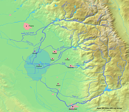 A seemingly inexhaustible wealth of water supported the expansion of Central Valley farming communities in the last two decades of the 1800’s. Artesian wells irrigated the semi-arid land in Pixley, Tipton, and Tulare. But by the early 1900s, these wells dried up, and farmers began drilling deeper wells and pumping ground water to nourish crops. The once-vast wetlands shrank and shriveled as farm operations increasingly diverted water from the Kaweah, Tule, and Kern rivers until Tulare Lake, once the largest body of fresh water west of the Mississippi, was gone.