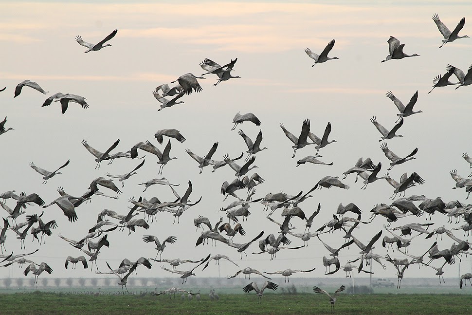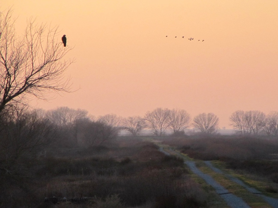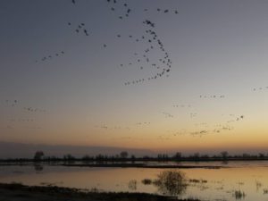 “Before the cranes fly in, White-face Ibis arrive by the thousands, often forming dense black clouds of birds before funneling into the marsh. Ibis with their down-turned impressive bills are bronzy-colored long-legged wading birds of fields and marsh. Immediately after these dark waders settle into their night roost, lines of cranes from all directions fill the horizon, announcing their approach with their loud bugling calls.” — Tulare County Audubon Society