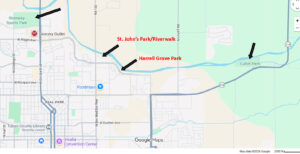 Addresses: Visalia’s paved, multi-use St. John’s River Trail travels 4.4 miles along its namesake river from Riverway Sports Park, 3611 North Dinuba Blvd. (Hwy. 63 N), on its west end, to Cutler Park, 15520 Ivanhoe Dr., on its east end.  Both these sites have parking, potable water, picnic facilities, playground equipment, and restrooms, and are ADA accessible.