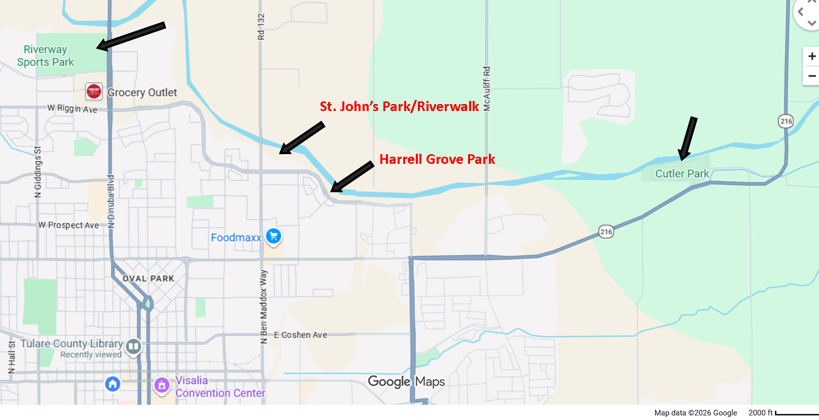 From downtown Visalia, take Hwy 198 east to exit north (left) on Ben Maddox Way and follow N. Ben Maddox to Riverwalk and/or St. John’s Park (2457 N. Ben Maddox).