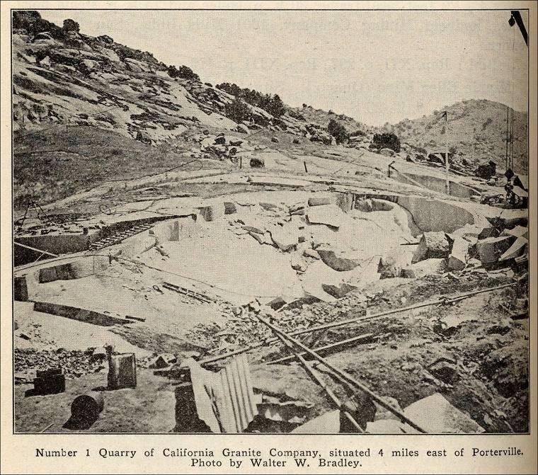 The granite was quarried on the west side of Porterville Rocky Hill just south of Bartlett’s magnesite mine. . . . Magnesite workers were used in the quarry . . . . Bartlett was unable to complete the building for the stipulated amount and paid some two thousand dollars of the cost himself. . . . The Porterville High School publication El Granito memorializes this old granite structure.” — Los Tulares #44, June, 1960